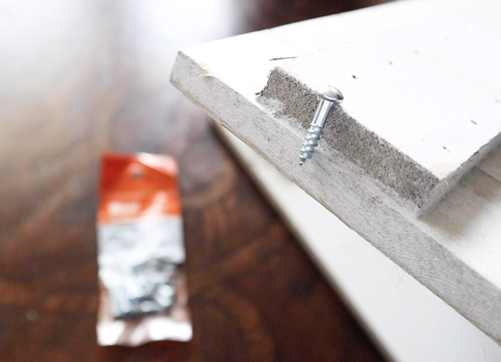 I picked up some 3/4” wood screws from Lowes. I had measured the height of the location I would be drilling these screws in before my shopping trip to make sure I didn’t get any that were too long, because then they would have popped through the top, and well, that just wouldn’t have looked too good.