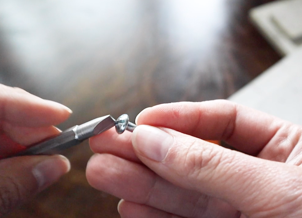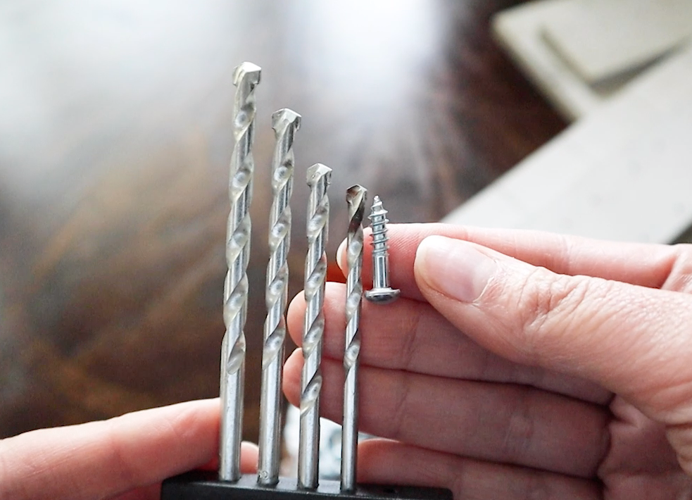 I figured out which drill bit to use just by eyeballing the screw next to them and picking one that was a tiny bit smaller. Nothing too technical here. Then I just did something similar here, testing out which screwdriver bit would match the screw head. Now, I’ve got my tools and supplies all ready to go. This is so easy, there are only a couple steps!